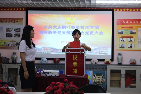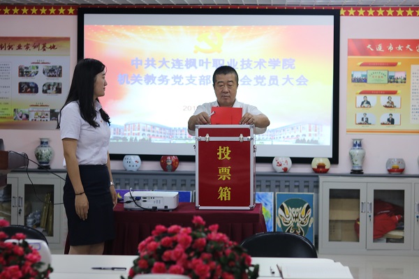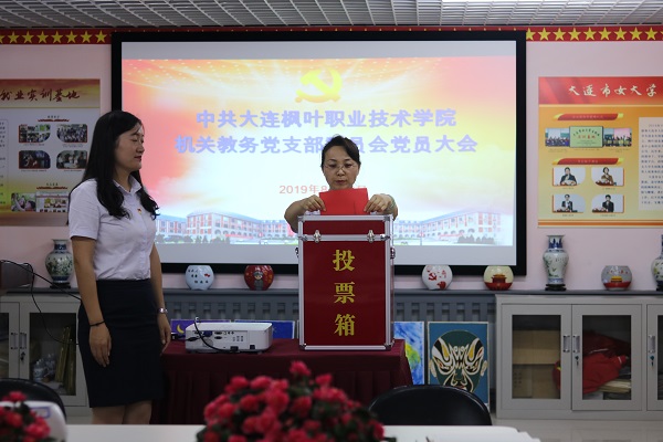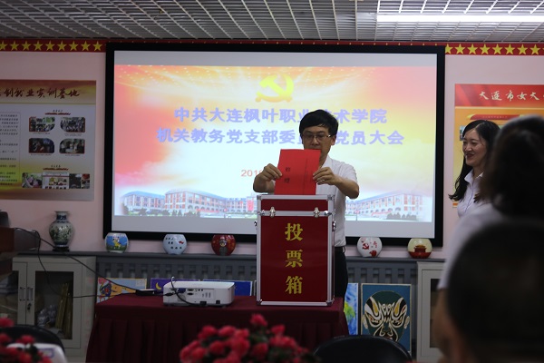 会议伴随着庄严的《国歌》拉开帷幕,大会由徐辉同志宣读《中国共产党大连枫叶职业技术学院机关教务支部委员会议选举办法》,审议通过监票人、计票人名单,大会以无记名差额投票的形式从4名候选人中选举产生支部委员。经投票选举王小溪、孙永欢、隋琛珂三位同志当选为机关教务党支部第一届委员。
