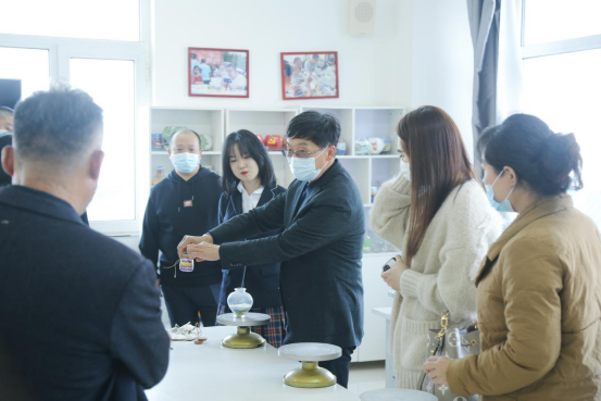 到访人员先后参观了无人机实训基地、机器人实训室、新能源实训基地、茶艺室等实训基地和实训室,并详细询问了学生的就业情况,对学院取得的成绩予以充分肯定。参观后双方在党员活动室进行了深入会谈。座谈会上,甘井子区工商联主席范业民对学院的教育教学管理和项目建设给予了高度评价,并提出商会需要凝聚会员力量,发挥好桥梁和纽带作用,会员之间要互动、互助、互融,实现共同发展。杨捷对各位领导的到来表示热烈欢迎,从党建工作、参政议政、爱心奉献、创新服务、整合资源、学习和提升六个方面介绍了营城子街道商会的工作情况,提出营城子街道商会“十四五”时期的工作计划。一是要借助国家职业教育的东风,推进校企合作,工学结合,协同育人,共办产业学院。二是参加各级各类培训,与科研院所合作,实现转型升级。三是与其他街道商会、区工商联及外埠商会深度合作,整合资源,全力支持中小企业的发展,发展会员与更多的企业共同成长。四是发挥好桥梁和纽带作用。随后,与会代表分别介绍了各自情况并就校企合作、人才发展进行交流发言。