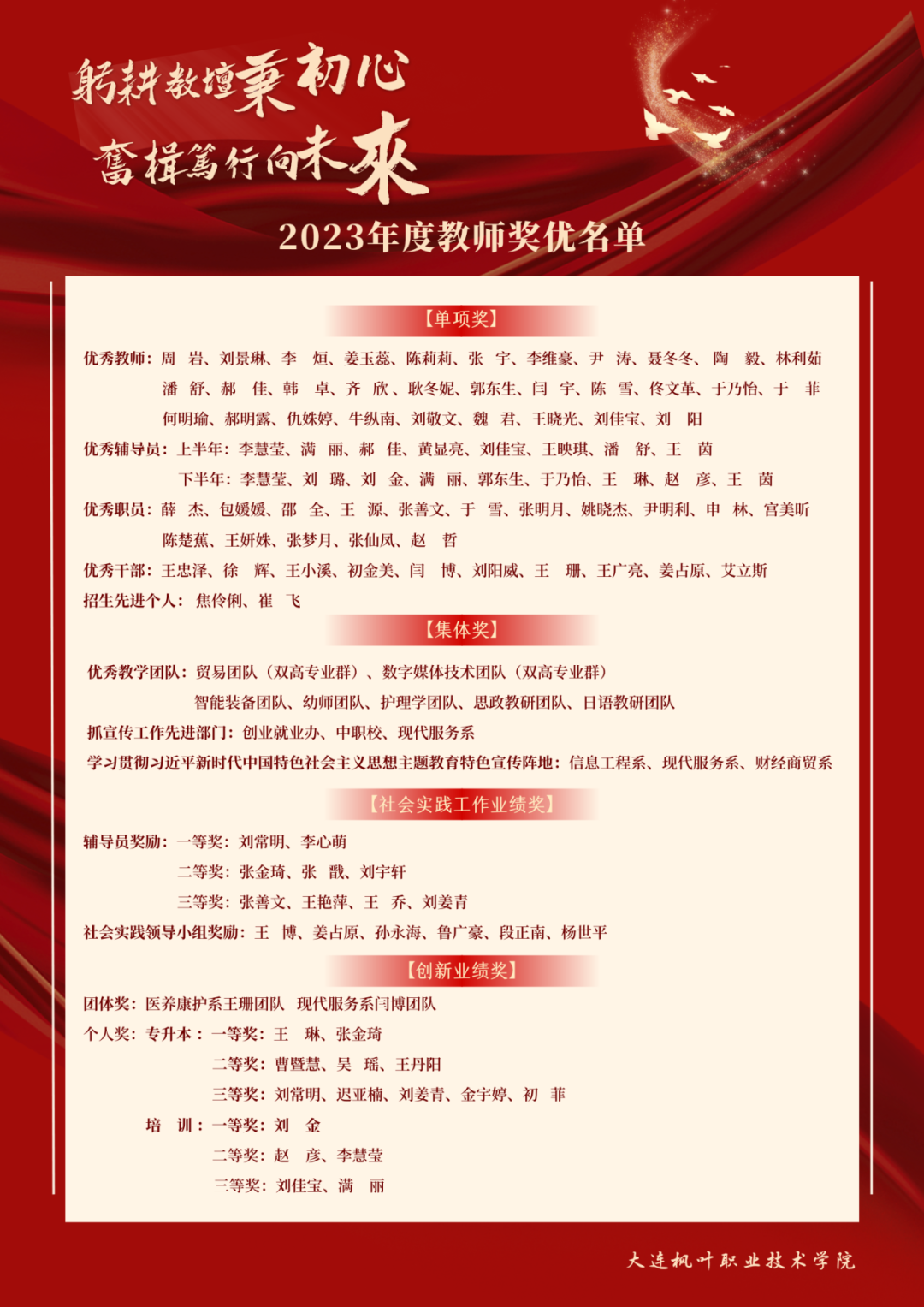 2023年是学院发展史上具有里程碑意义的一年,学院教育事业取得跨越式发展,各项工作迈上新台阶。自强之道,以育人为本,在学院带头人、领路人杨捷院长带领下,全院教职工勠力同心、奋楫笃行,以红烛照学子,黄卷润心田的枫叶精神,成就桃李英才出的枫叶佳话。