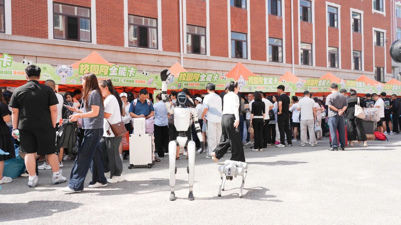 迎新现场科技氛围浓厚,“顶流明星”当属忙碌的机器人与机器狗。在行李搬运区,灵活的机器狗成为“得力助手”,不仅减轻了行李搬运的负担,更让新生们忍不住驻足拍照,直呼“太酷了”;在校园报到区,可爱的智能机器人化身“拍照向导”,不仅能打招呼、握手,还能摆出各种萌趣姿势与新生合影。这一创新环节不仅成为迎新现场的 “打卡热点”,更展现了学院以科技赋能校园生活、助力学子成长的育人理念。